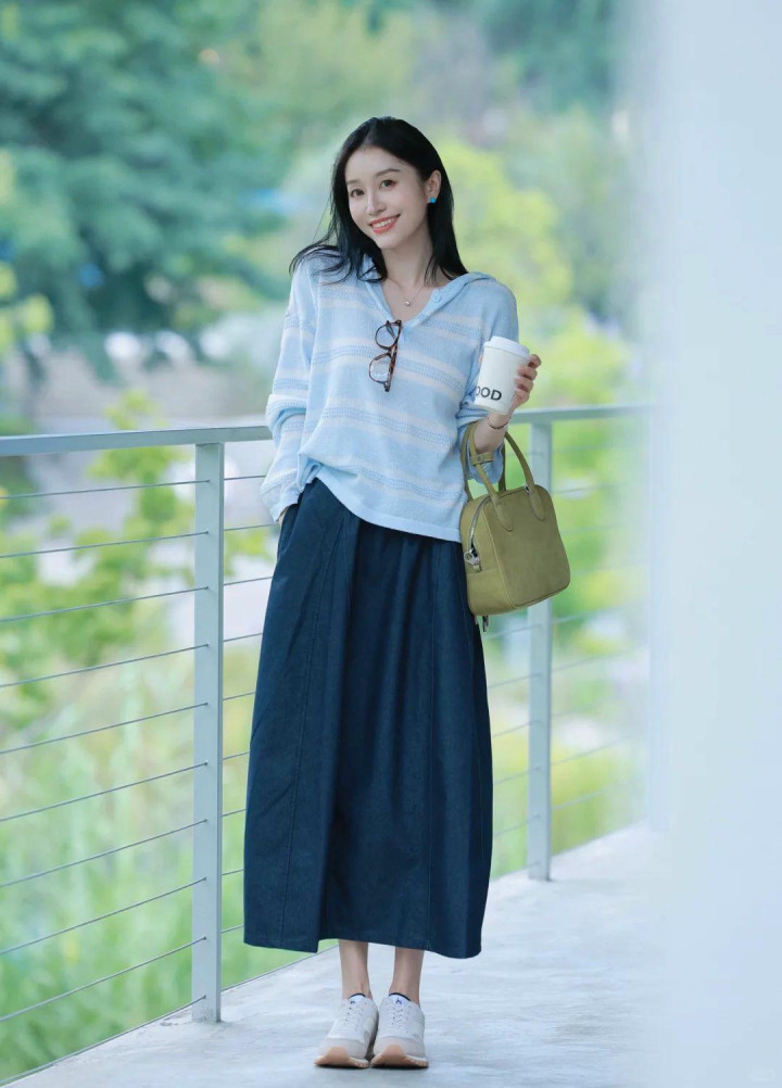 于户外阳台,她是享受咖啡时光的时尚达人,浅蓝色条纹连帽毛衣袖子自然垂落,如海浪轻抚沙滩般自在。脖子挂着的眼镜与右手白色纸杯,是生活化的时尚细节。下身深蓝色阔腿牛仔裙随性,浅灰色运动鞋舒适,斜挎橄榄绿色手提包的金属装饰注入活力。她黑发披肩,微笑面对葱郁绿植,诠释 “舒适即时尚” 的职场态度。