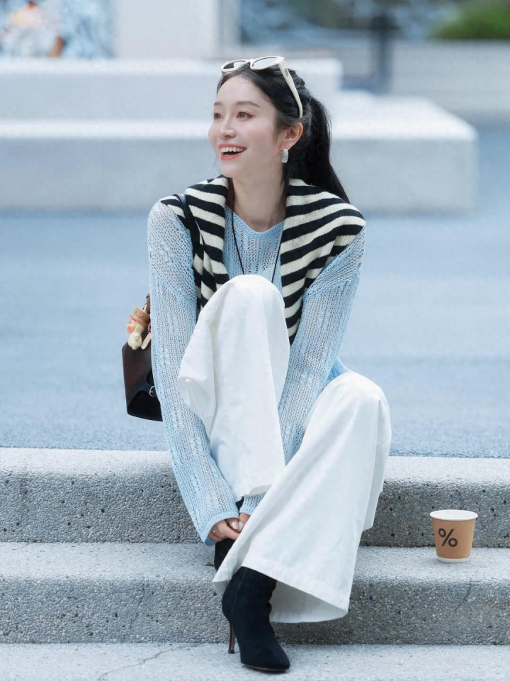 于创意会议室,她是灵感泉涌的时尚思索者,黑蓝相间条纹毛衣的色彩碰撞,宛如钢琴键上跳跃的音符。领口别致的米白色边框太阳镜,成为造型的俏皮亮点。白色阔腿裤垂坠如云朵,双腿交叠,尽显职场从容。黑色乐福鞋经典,红指甲亮眼,左手咖啡杯热气升腾,与右手边黑色菱格链条包质感相衬。蓝色发箍增添活力,在柔和光线中,她笑容甜美,诠释 “轻松即专业” 的职场哲学。