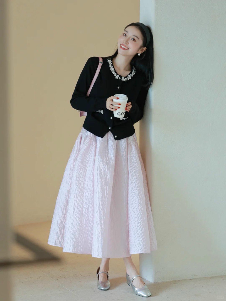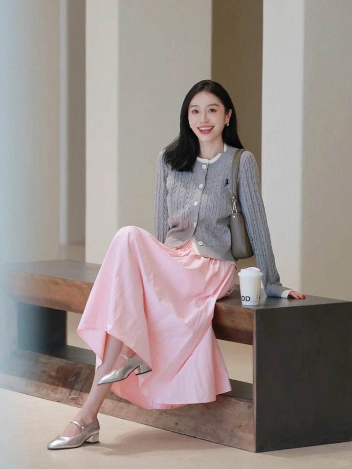 在初秋午后,她如窗前驻足的温婉女子,黑色开衫毛衣领口的花朵状珠宝,如夜空中闪烁的星辰,赋予造型华丽诗意。淡粉色长裙褶皱纹理似花瓣绽放,面料摇曳生姿,倾诉着职场女性的温柔。银色玛丽珍鞋闪耀,浅粉色包色调柔和,右手印着 “GO” 的纸杯,仿佛为其优雅前行助力。黑色发箍与小巧耳钉细节精巧,站在浅色墙边,她眉眼含笑,如春风拂面,诉说 “甜美即专业” 的职场美学。