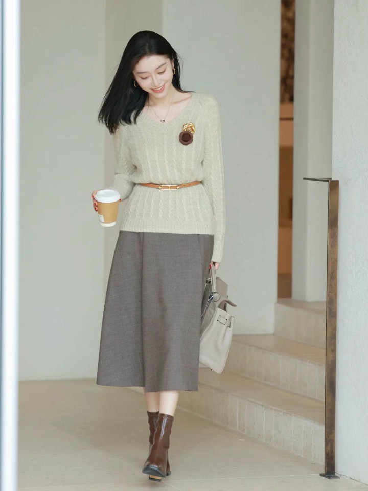 她像晨光中品味诗集的职场佳人,米白色 V 领麻花针织毛衣的纹理,似秋日麦田般温暖且质感十足。胸前精致的花朵胸针,宛如神来之笔,为简约设计添一抹艺术韵致。深灰色中长款半身裙垂坠如绸,腰间棕色皮带勾勒身形,如同诗中的精妙标点。棕色短靴沉稳,浅灰色手提包低调,左手咖啡热气袅袅,为其优雅身姿镶上金边。立于简约白墙前,乌黑长发与精致配饰相互映衬,整套造型如一首凝练的职场诗篇,诠释 “知性即力量”。