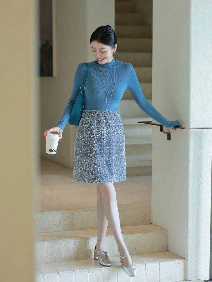 在精致办公楼中,她似优雅踱步的职场女王,蓝色高领长袖毛衣柔软贴合,银灰色亮片短裙如星河倾泻,为造型添低调奢华。银色平底鞋简约,蓝色包包同色系搭配,如色彩交响。左手白色杯子上的 “GOO” 字母,与右手长项链优雅呼应。站在简洁楼梯背景前,她妆容精致,笑容甜美,诠释 “华丽即内涵” 的职场宣言。
