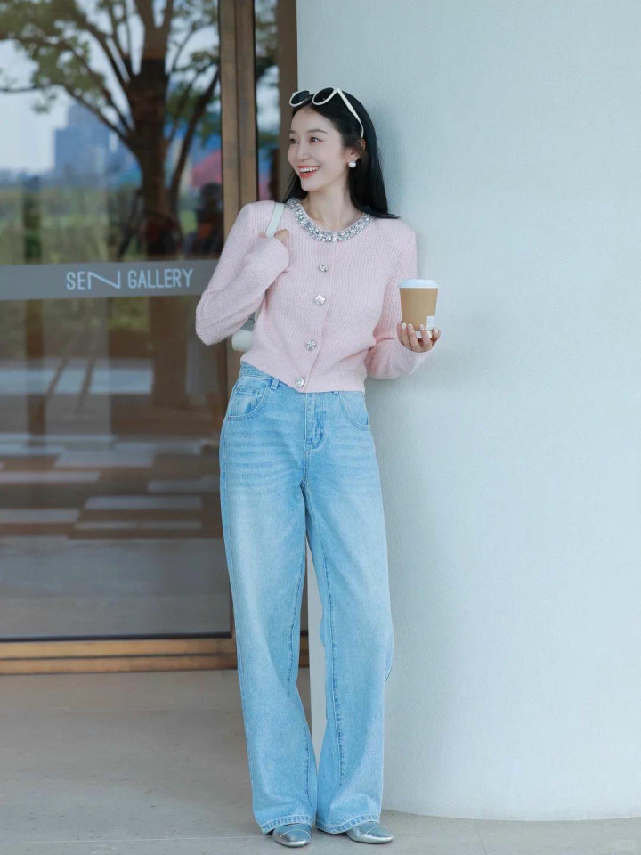 在初秋午后,她宛如享受咖啡的都市丽影,粉色短款毛衣领口的闪亮钻饰,如夜空中闪烁繁星,为造型添青春活力。浅蓝色阔腿牛仔裤随性,银灰色平底鞋舒适,左手棕色纸杯咖啡与右手浅色包,构成生活化时尚搭配。站在 “SEN GALLERY” 玻璃门前,她长发披肩,笑容惬意,玻璃门上树木倒影与穿搭和谐,演绎 “俏皮即专业” 的职场美学。