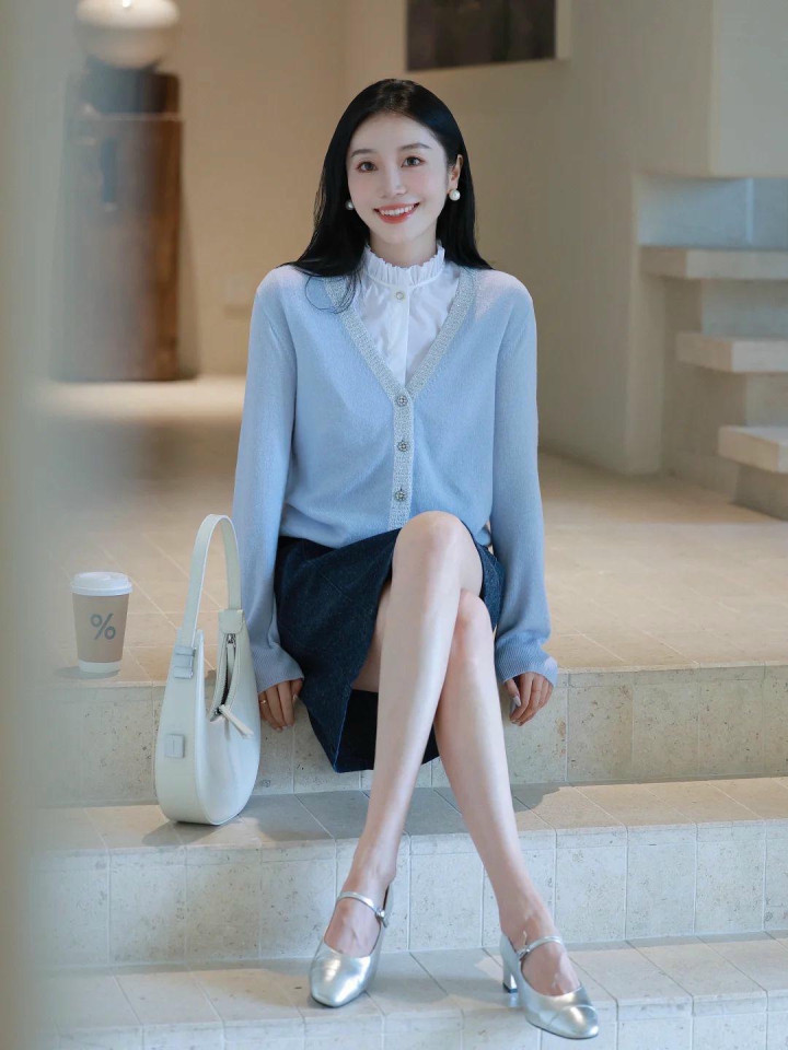 她如初秋午后享受静谧的温柔女子,浅蓝色 V 领针织开衫的精致纽扣,似精心排列的珍珠,内搭白色荷叶边衬衫层次丰富如花瓣。下身深蓝色半身裙侧边开叉,为造型点睛。银色玛丽珍鞋闪耀,与整体色调和谐。身旁白色手提包简约,地上咖啡杯富有生活感,珍珠耳钉增添优雅韵味。站在楼梯与室内陈设前,她黑发披肩,笑容甜美,诉说 “温柔即力量” 的职场哲学。