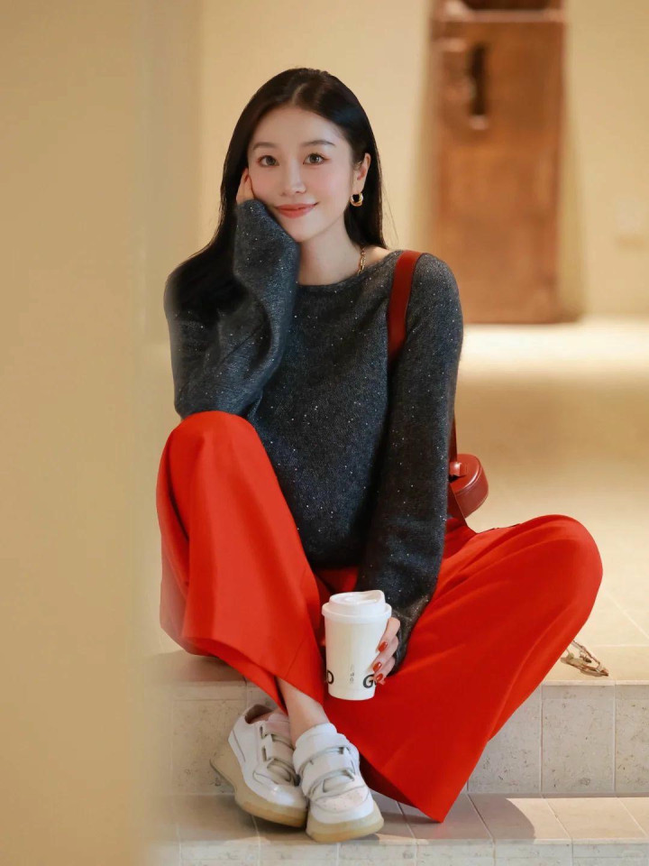 在现代艺术空间,她仿若游走的时尚先锋,深灰色带细闪的长袖毛衣,如夜空闪烁的星河,低调奢华。下搭红色阔腿裤,大胆用色似画布亮色,与白色厚底休闲鞋的简约形成反差,展现职场女性的自我表达。斜挎棕色包实用,白色纸杯随性,左手托腮,与背后暖色调环境和谐统一。站在木质物件旁,她以简约之姿诠释 “简约即态度” 的职场美学。